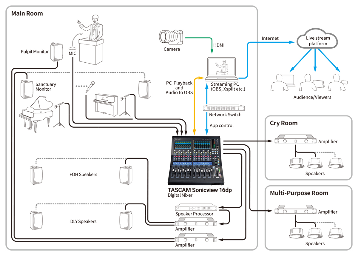 TASCAM Sonicview 16 is used for weekly worship services. Audio needs to reach not only the main sanctuary but also the cry and multipurpose rooms.