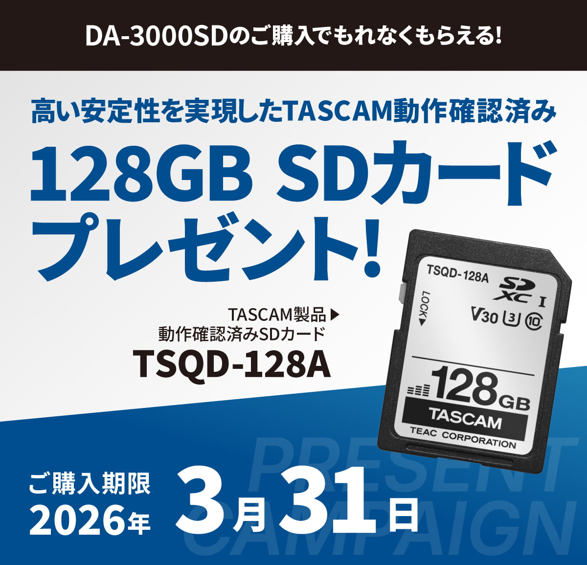 - 当キャンペーンは対象製品『DA-3000SD』のご購入1台につきTASCAM動作確認済みSDカード『TSQD-128A』を1枚プレゼントいたします。