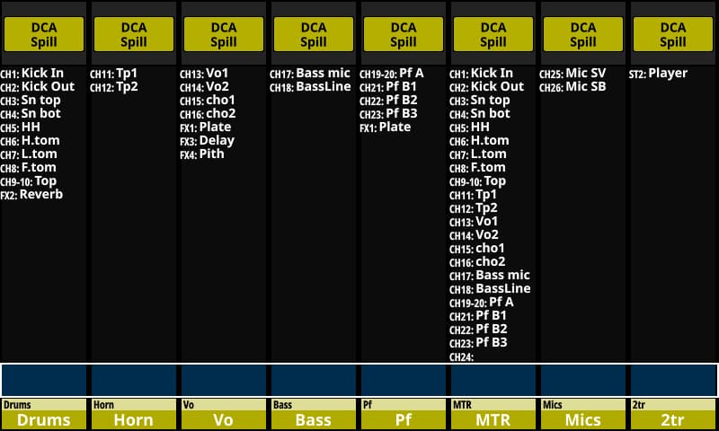 一例としてドラムをサブミックスした後、ドラムチャンネルをDCAに割り当てます。これで、1つのフェーダーでサブミックスの全体的なレベルを制御しながら、必要に応じてDCA内の個々のドラムチャンネルを調整できます。